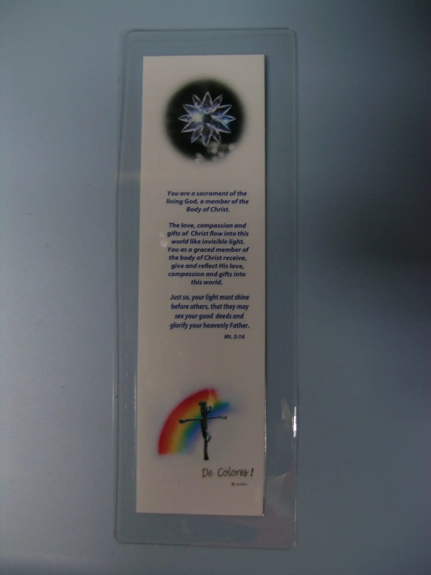 “You are a sacrament of the living God, a member of the Body of Christ. The love, compassion and gifts of Christ flow into this world like invisible light. You as a graced member of the body of Christ receive, give and reflect His love, compassion and gifts into this world. Just so, your light must shine before others, that they may see your good deeds and glorify your heavenly Father.” Mt. 5:16