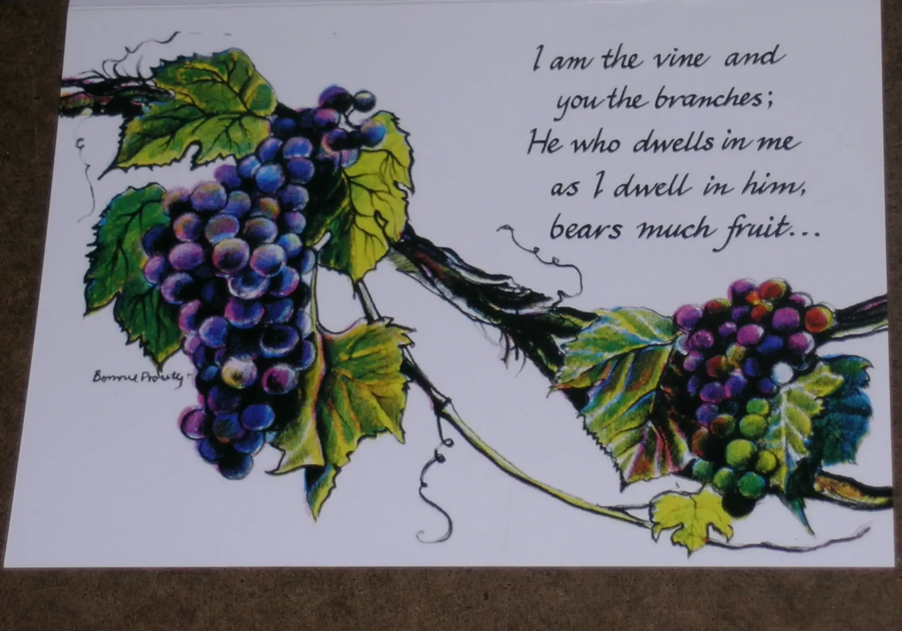 Card reads: “I am the vine and you the branches; He who dwells in me as I dwell in him, bears much fruit…”  John 15:5