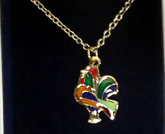 Colorful enamel rooster on a gold filled chain. Comes in a gift box.