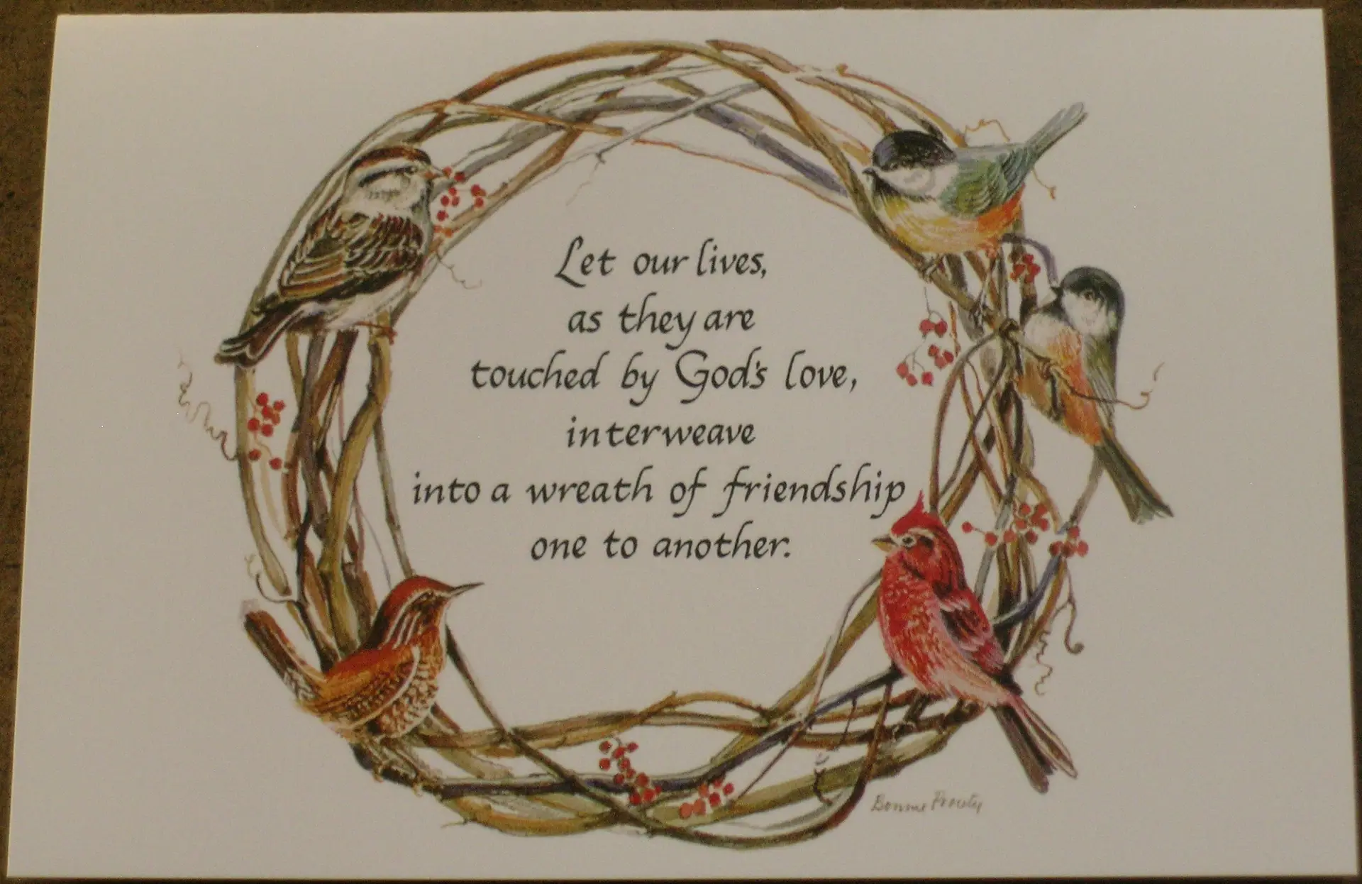 3×5 Notecards, 10 notes with envelopes Card reads, “Let our lives, as they are touched by God’s love, interweave into a wreath of friendship one to another.”