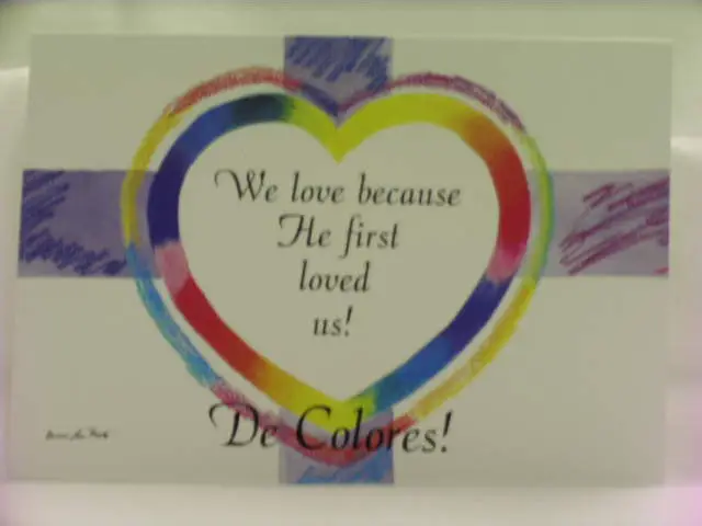 3 x 5 Notecards, 10 notes with envelopes Card reads, “We love because He first loved us! DeColores!”