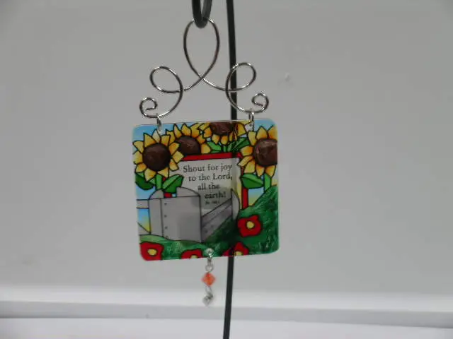 “Shout for joy to the Lord, all the earth!” Ps. 100:1 Joan Baker used Sunflowers and a uplifting verse to decorate this 3″ X 3″ Sun Jewel